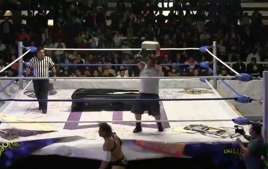 El luchador Ángel o Demonio lanza por la espalda un block de concreto a su rival El Cuervo de Puerto Rico por lo que la Comisión de Box y Lucha Libre del Estado de México anunció la suspensión del territorio mexiquense para el luchador