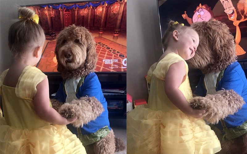 Una niña se vistió de su princesa favorita y bailó con su adorable Golden-Doodle alrededor de la sala de su casa, recreando una escena clásica de la película ‘La bella y la bestia’.