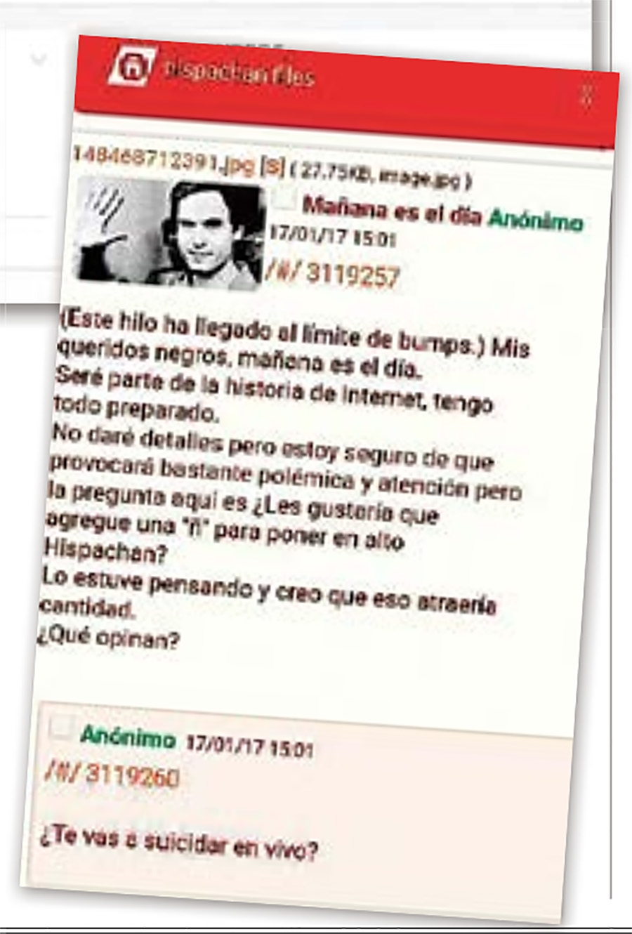 “Mis queridos negros, mañana es el día. Seré parte de la historia de Internet, tengo todo preparado. No daré detalles, pero estoy seguro de que provocará bastante polémica y atención pero la pregunta aquí es ¿les gustaría que agregue una ‘‘ñ’’ para poner en alto Hispachan? Lo estuve pensando y creo que eso atraería cantidad. ¿Qué opinan?”, se lee en el mensaje posteado presuntamente por el autor en dicho foro.