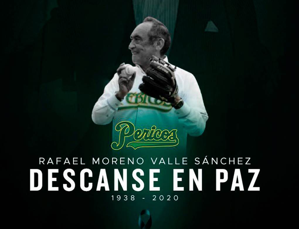El Club de Béisbol Pericos de Puebla y @pepemiguelb envía sus condolencias a la familia del contador Rafael Moreno Valle Sánchez quien fuera dueño del equipo en diversos etapas (70’s, 90’s y 2007-2014) y promotor del rey de los deportes ?? en nuestro estado.