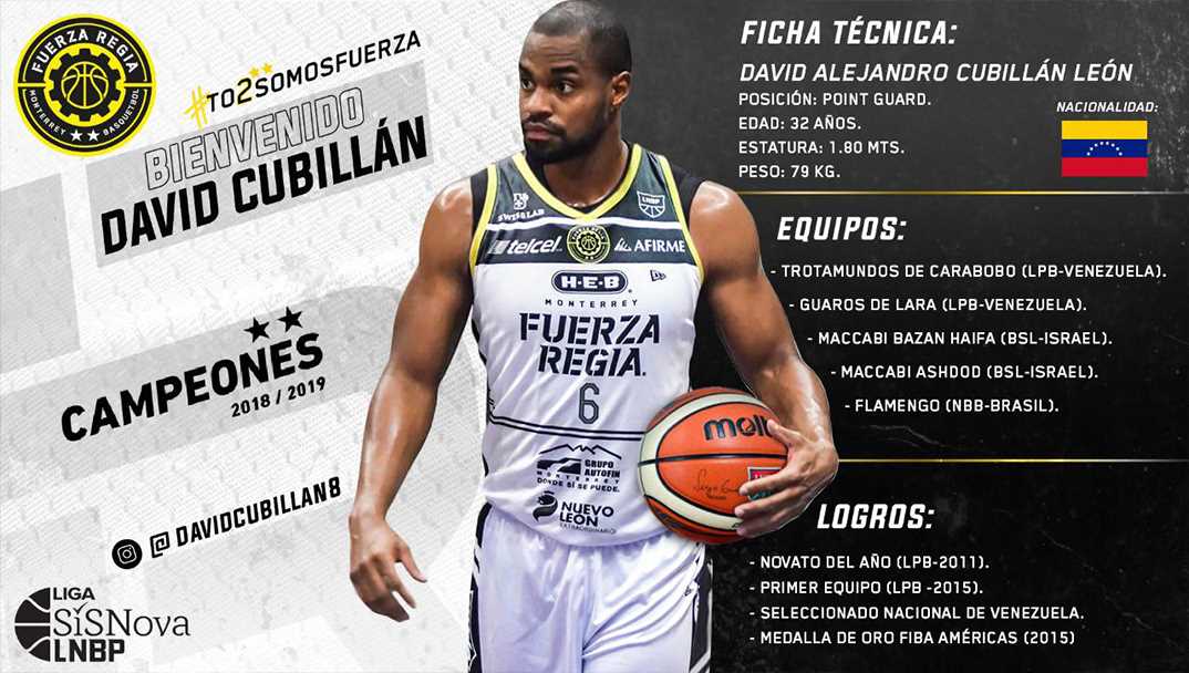 La quinteta profesional de Fuerza Regia anunció el fichaje del venezolano David Cubillán León, quien se integrará al conjunto Campeón de la Liga Nacional de Baloncesto Profesional (LNBP) por lo que resta de la Temporada 2019-2020.