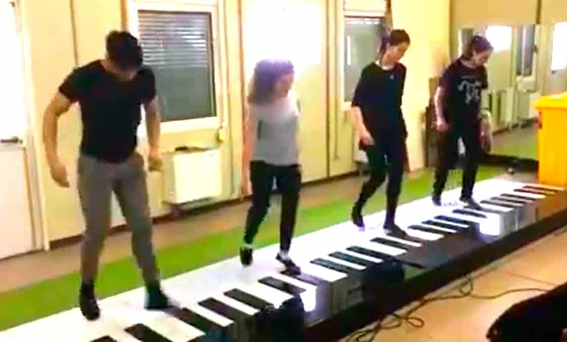 En el video que fue publicado en Facebook y que ha sido compartido más de cuatro millones de veces, se ven los curiosos pasos de baile con los que los artistas producen el sonido en un piano enorme de siete metros.