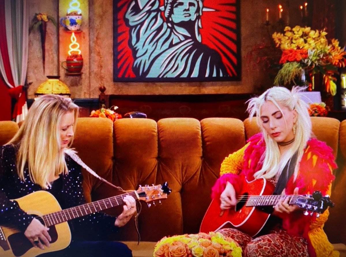 Lady Gaga, con un estilo bastante noventero que incluyó un brillante abrigo rojo con amarillo, un top blanco y unos leggins rojos con blanco, sorprendió a Phoebe durante su desafinado cantar. “Es extraño, estaba caminando por la calle y resulta que tengo mi guitarra”, expresó la cantante mientras mostraba su instrumento rojo.