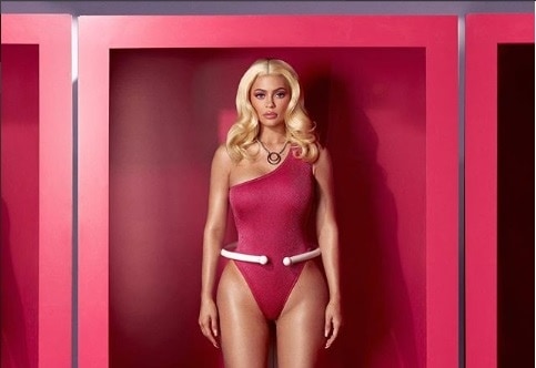 Podemos ver a la empresaria de los cosméticos luciendo una hermosa cabellera rubia, con un sexy traje de baño rosa estilo one piece.