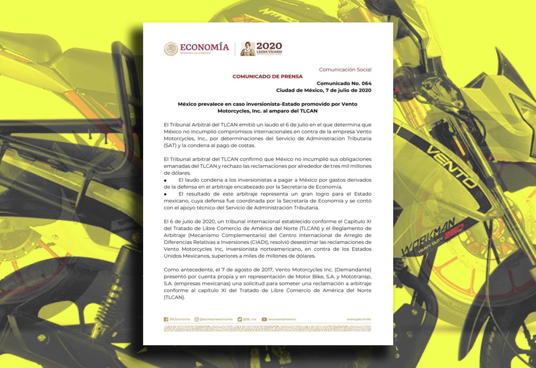 #Comunicado | México prevalece en caso inversionista-Estado promovido por Vento Motorcycles, Inc. al amparo del TLCAN#GobiernoDeMéxico pic.twitter.com/h0jOJOMgOt