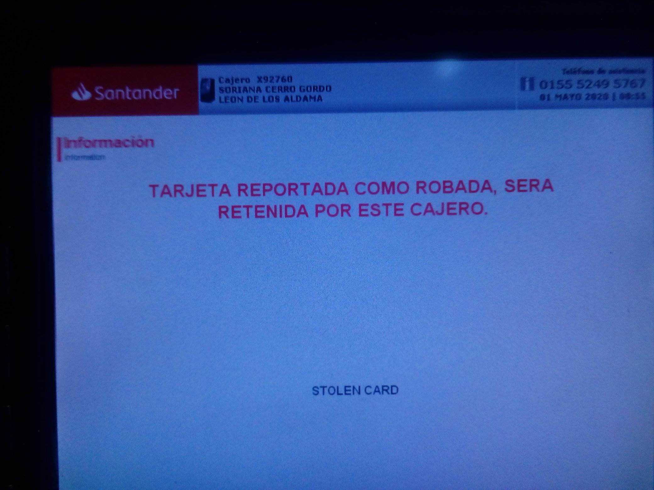Eh no mmen qué pedo @bancosantander ? Al parecer todos los cajeros Santander están reteniendo las tarjetas por un supuesto reporte de robo. pic.twitter.com/lRdXcEOSGm