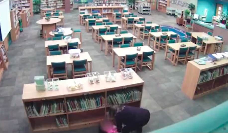 En el video se observa a la niña escondiéndose en una estantería para libros a nivel del piso en la biblioteca de la escuela, mientras la maestra Smith dialoga con otra mujer.