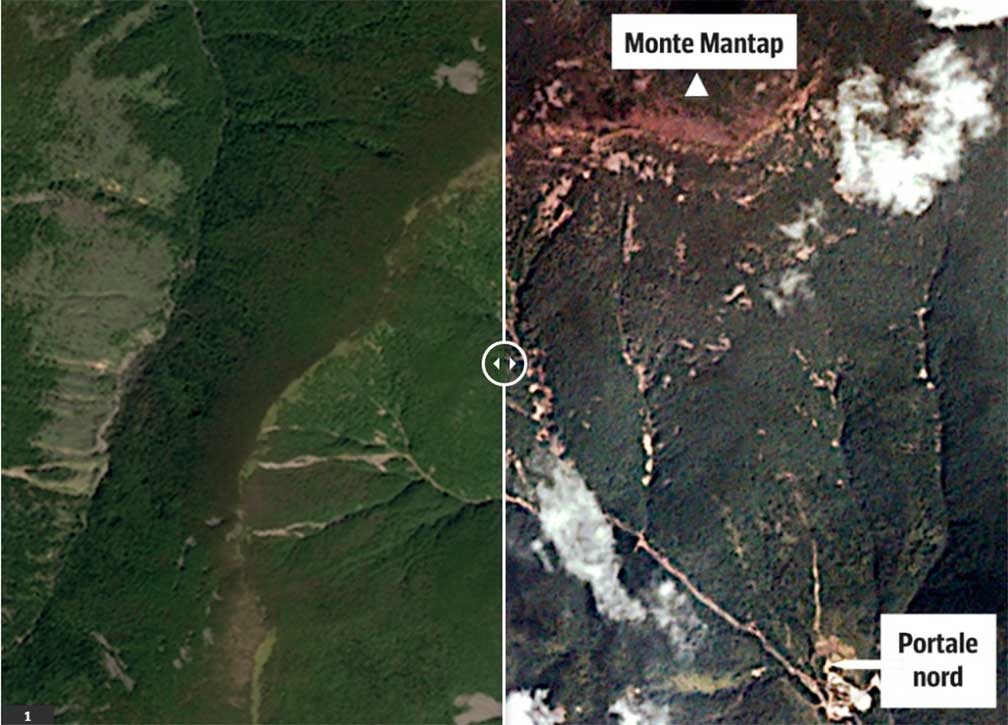 Una parte cercana a la cúspide del monte Mantap (donde se ubica el sitio de pruebas nucleares Punggye-ri, en el noroeste de Corea del Norte) se deslizó hacia ese cráter, dejando un rastro visible a los satélites.