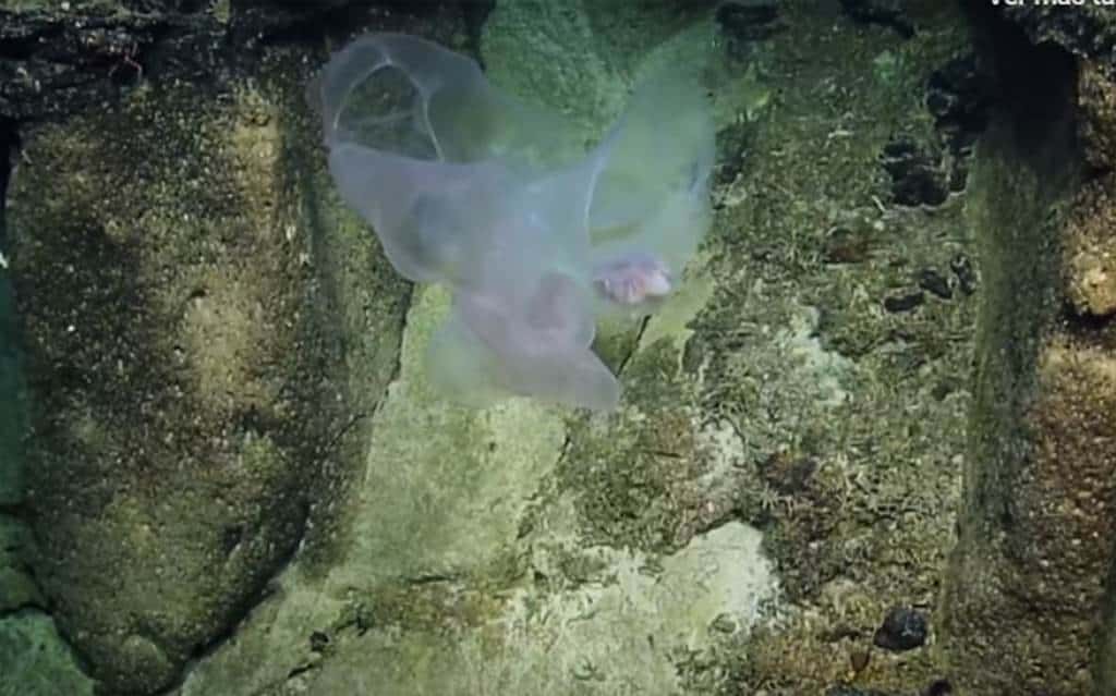 Un equipo de investigadores de aguas profundas encontró a principios de este mes una criatura flácida y sin extremidades, flotando como fantasma sobre el fondo marino del Pacífico, a la cual confundieron con una bolsa de plástico, pero en realidad era una rara medusa.