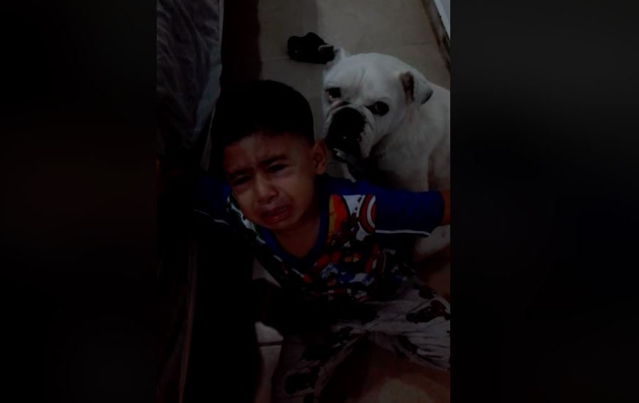 La grabación, que se viralizó y conmovió a miles de usuarios, muestra cómo el pequeño intenta cubrir con su cuerpo a su amigo llamado "Zeus", mientras la mascota muestra una cara de arrepentimiento.