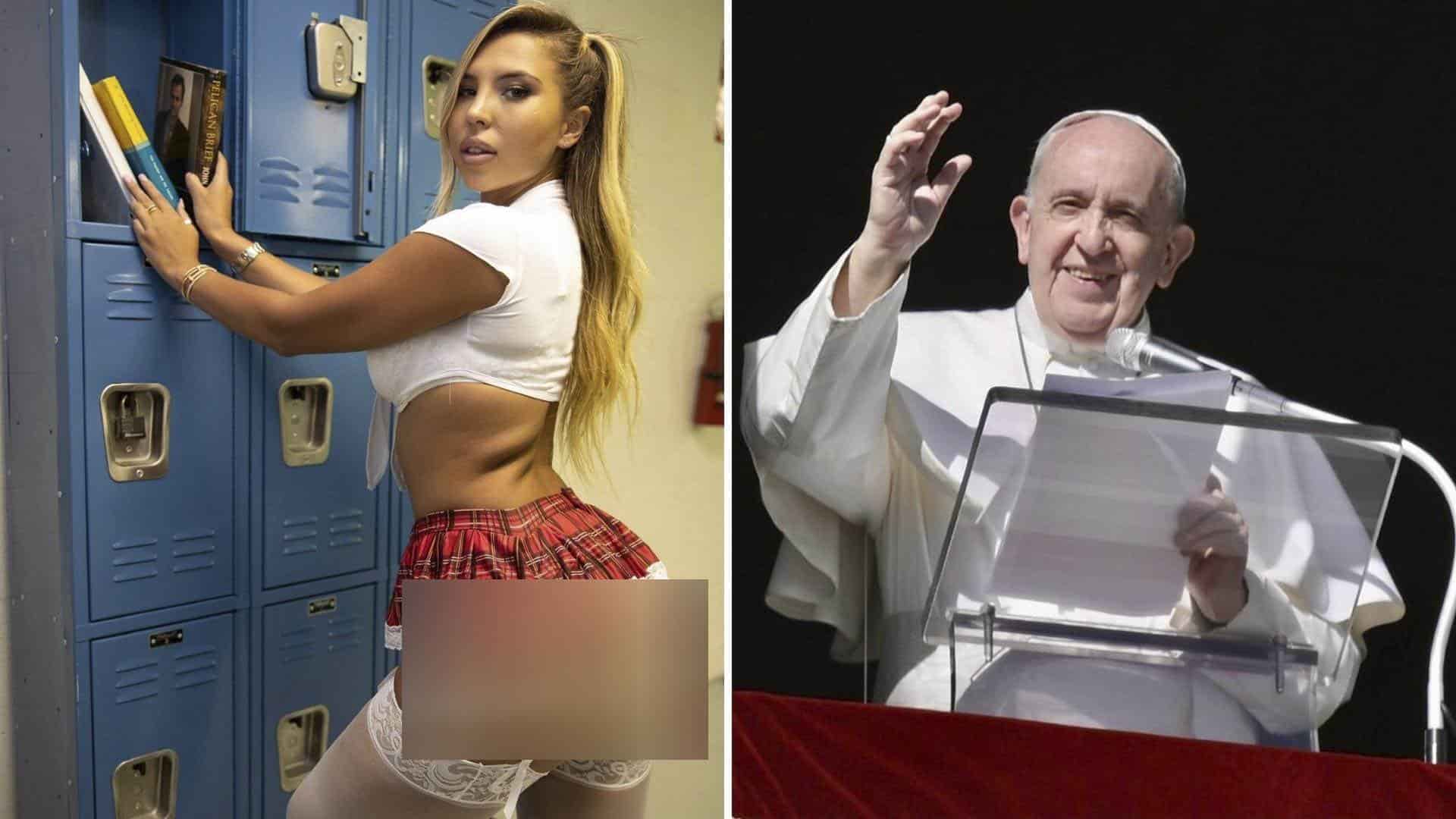 En la foto donde presuntamente la cuenta del Papa le dio "like", aparece la modelo brasileña vestida de colegiala, con una camiseta blanca corta que enseña la cintura y una minifalda escocesa, mientras se apoya en una de las típicas taquillas de los estudiantes en los institutos.
