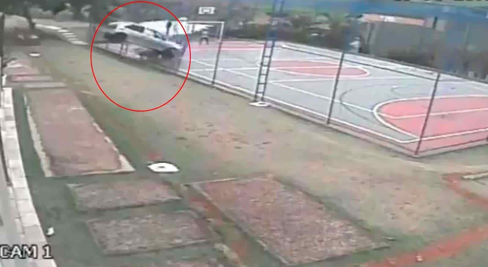 Posteriormente uno de los niños va por el balón pero casi de inmediato se percata del automóvil que se dirige hacia ellos e intenta alejarse cuando en la imagen aparece volando literalmente el vehículo a gran velocidad y termina impactándose sobre la malla ciclónica.