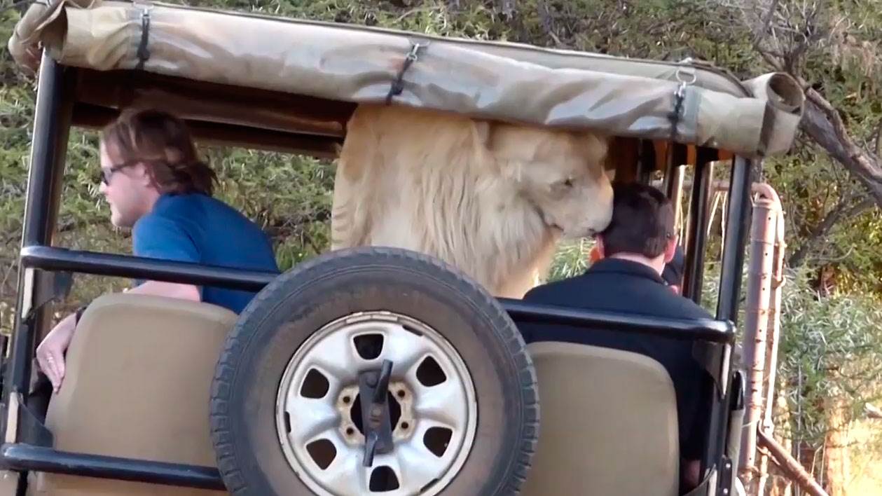 Un grupo de estudiantes que se encontraba realizando un safari en el Parque Nacional Kruger de Sudáfrica se llevó un gran susto cuando un león blanco adulto saltó al jeep que los transportaba.