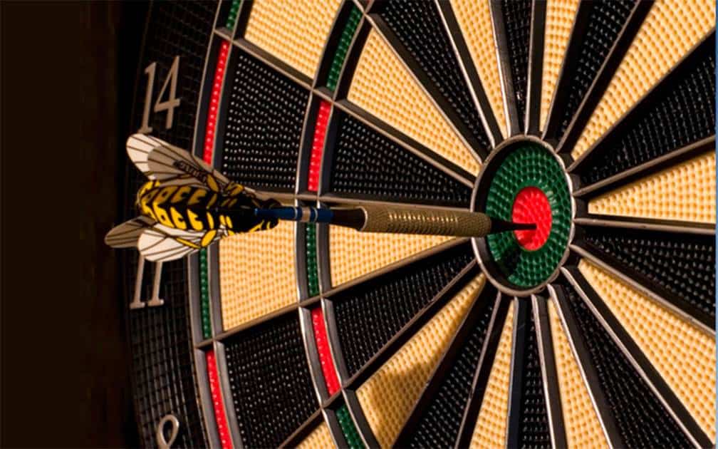 La mujer se sienta debajo del tablero confiada de su novio a quien le pide que arroje el dardo.