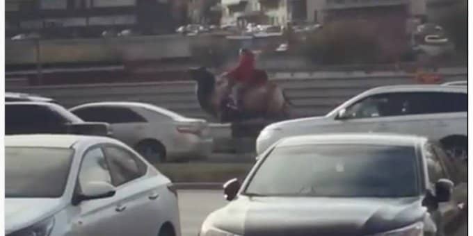 Una mujer encontró la manera de evitar el tráfico utilizando un camello en las horas pico en una autopista de la ciudad rusa de Novosibirsk