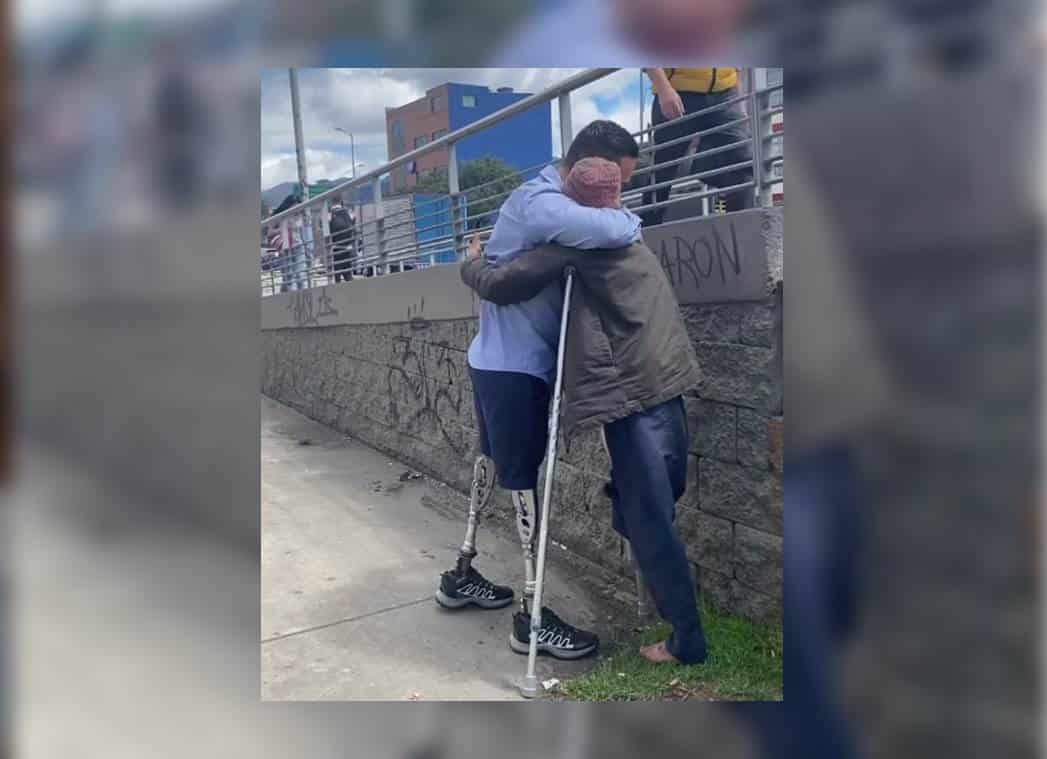 Policía de Bogotá con prótesis regala muletas a mujer sin pierna