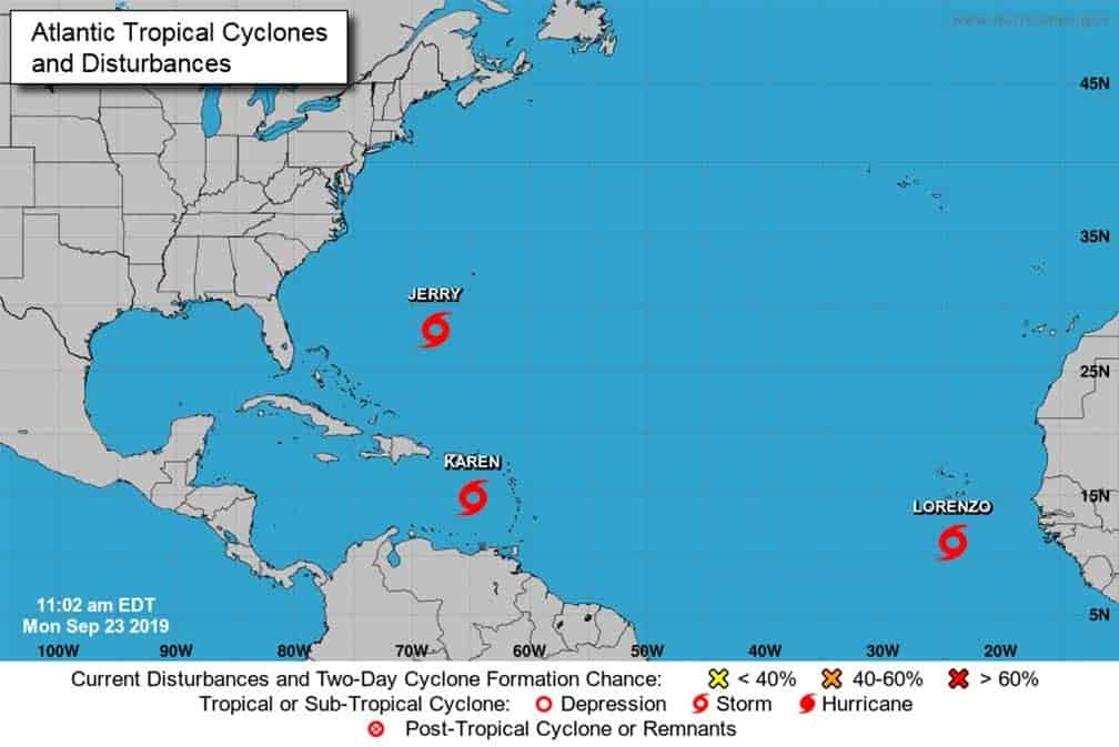 La primera de ellas es Karen, que avanza por el Caribe rumbo a Puerto Rico, donde se espera que impacte el martes a última hora o el miércoles con sus vientos máximos sostenidos de 40 millas por hora (65 km/h).