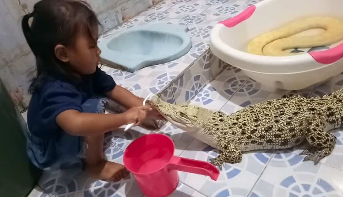 En redes sociales circulan videos en los cuales se muestra como una niña de alrededor de 4 años le cepilla los colmillos a un cocodrilo y también le pone talco, pero también juega con una pitón y unas aves exóticas.