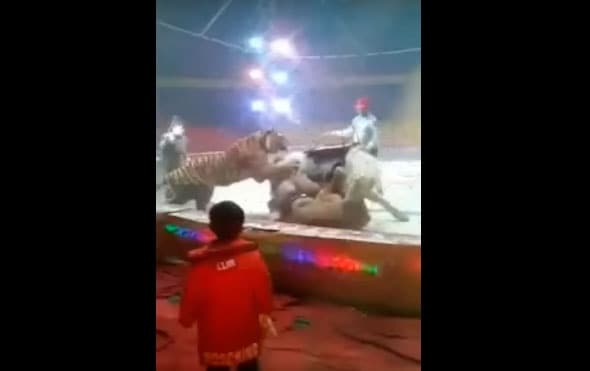 Un tigre y una leona atacan a un caballo en plena función de circo