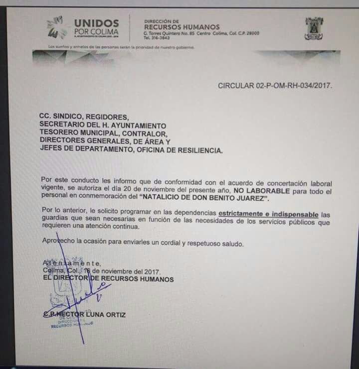 A través de redes sociales se ha vuelto viral una carta firmada por el Ayuntamiento de Colima donde indica a los trabajadores sobre el puente vacacional del 20 de noviembre; sin embargo, en el escrito se aprecia un pequeño resbalón que confunde la festividad a conmemorar