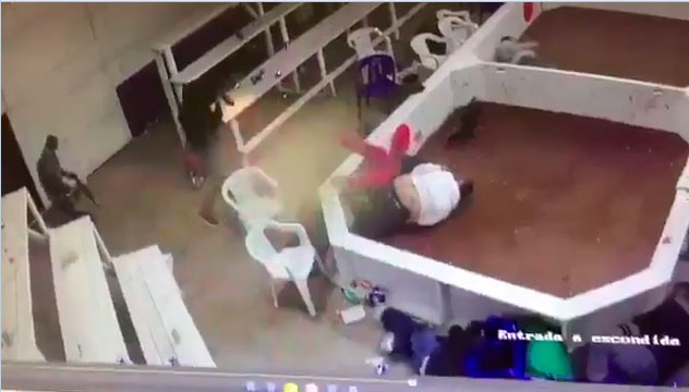 En las imágenes se observa entrar a un hombre encapuchado quien empieza a disparar hacia las personas que se encontraban sentadas en las gradas, incluso un hombre de pantalón rojo intenta cubrirse de los balazos, pero cae tendido sobre uno de los corrales, donde se llevan a cabo las peleas de gallos.
