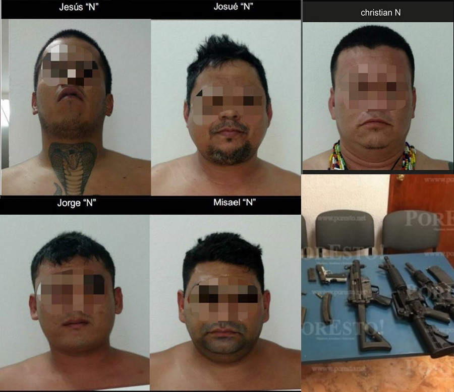 Los detenidos se identificaron como Jorge M F. G, Josué S. M., Christian G. M. T. Misael M. G y Alberto S. R., a quienes se les decomisaron tres armas largas de las conocidas como R15, una arma corta tipo escuadra, con sus respectivos cargadores, y cartuchos útiles, así como los dos vehículos.