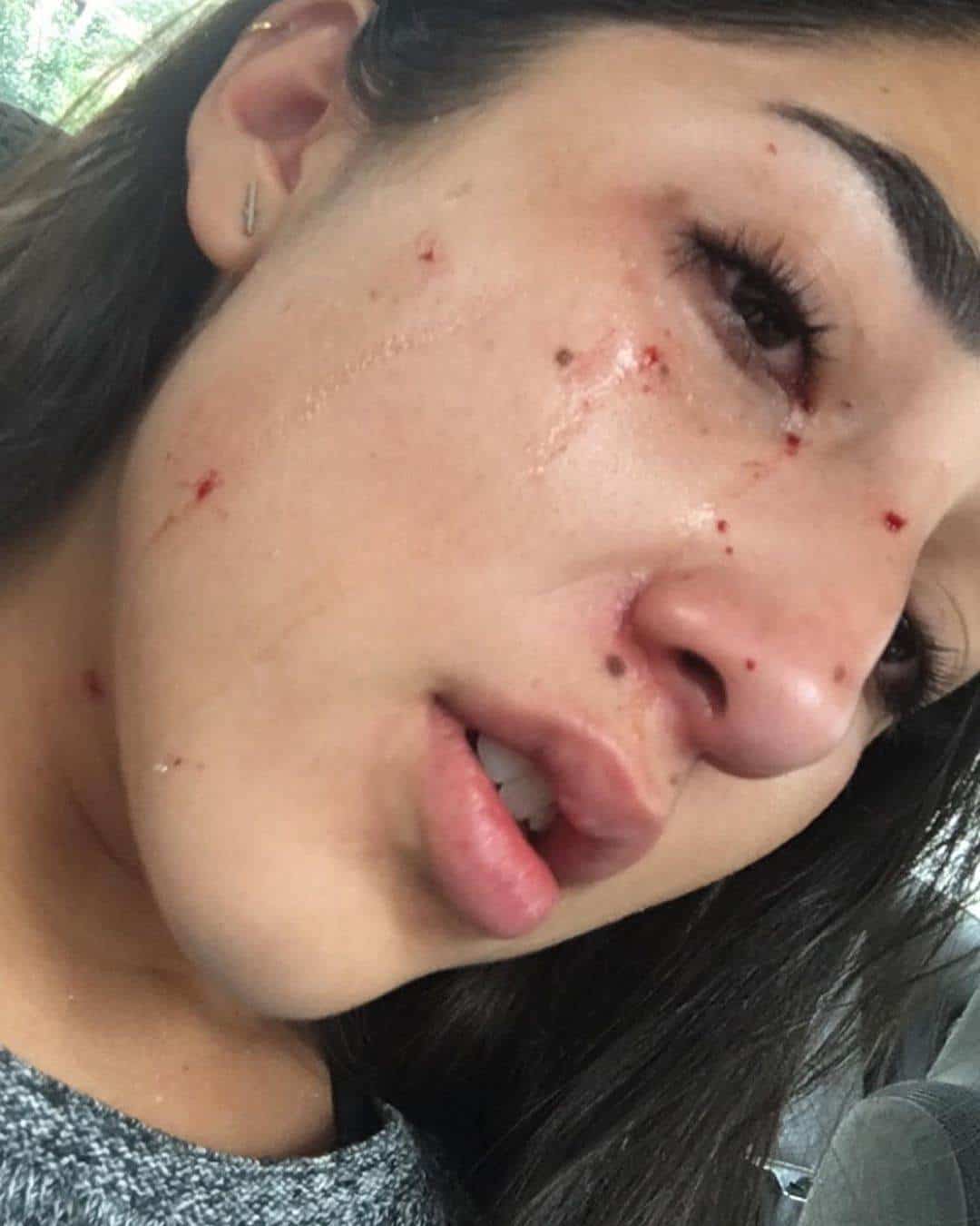 La joven agredida publicó imágenes de los daños que sufrió por los cristales rotos, además dijo que recibió un golpe en el pómulo con el bate.