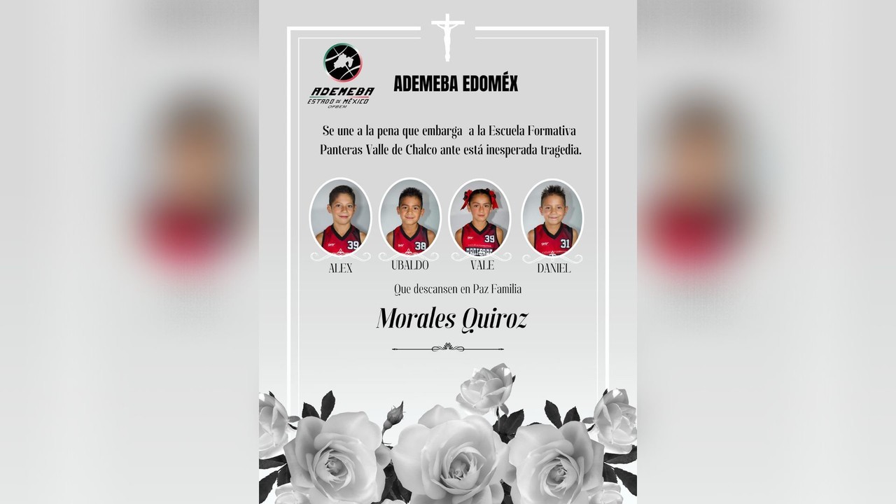 Autoridades de Oaxaca informaron que cuatro hermanos basquetbolistas murieron durante este miércoles 5 de abril tras un accidente vial en la carretera Oaxaca-Cuacnoplan.Según comunicó la Escuela Formativa Panteras Valle de Chalco, donde jugaban los menores de edad, los niños fueron identificados como Alex, Ubaldo, Vale y Daniel, quienes tenían, 12, 9, 10 y 7 años de edad, respectivamente.De acuerdo con las pesquisas hechas por los mandos oaxaqueños, el suceso ocurrió cuando una camioneta tipo van y otra pick-up se estrellaron de frente en la autopista antes mencionada.Asimismo, se informó que la abuela y la mamá de los niños falleció igualmente en el incidente, mismo que dejó un saldo de 10 personas heridas.Tras el suceso, los cuerpos de los menores fueron despedidos en una ceremonia organizada por la institución educativa, a la cual acudieron familiares y compañeros, quienes con globos blancos, veladoras y una misa dieron el último adiós.