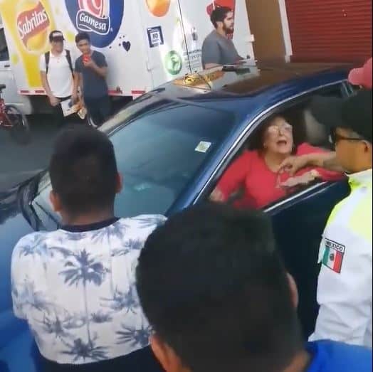 A través de redes sociales, circula un video del momento en que grupo de conductores movió el auto de una señora de la tercera edad que se negaba quitarlo a pesar de que estaba provocando caos vial por estar bloqueando la calle.