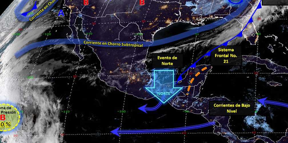 También se prevé evento de norte con rachas superiores a 70 kilómetros por hora (km/h) en el Istmo y el Golfo de Tehuantepec, y rachas de 50 a 60 km/h en el sur de Veracruz, Tabasco, Campeche y Yucatán.