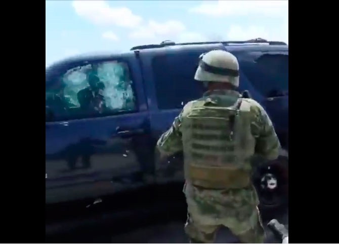 En la grabación se observa cómo los militares en un territorio semiárido comienzan a disparar en contra de los tripulantes de una camioneta color negra.