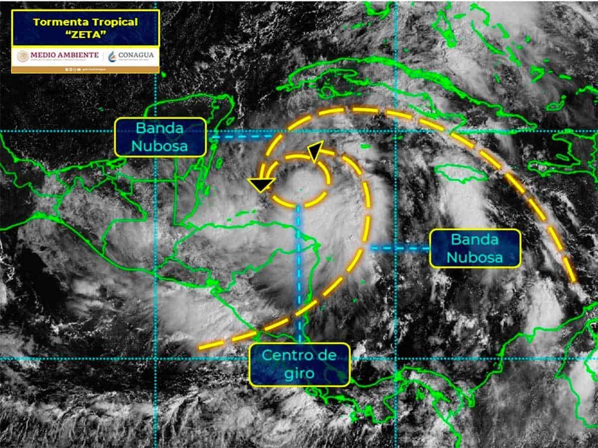 Según la trayectoria pautada, el centro de Zeta pasará al sur del oeste de Cuba el lunes temprano, y se moverá cerca o sobre el norte de la Península de Yucatán o el Canal de Yucatán a última hora del lunes.