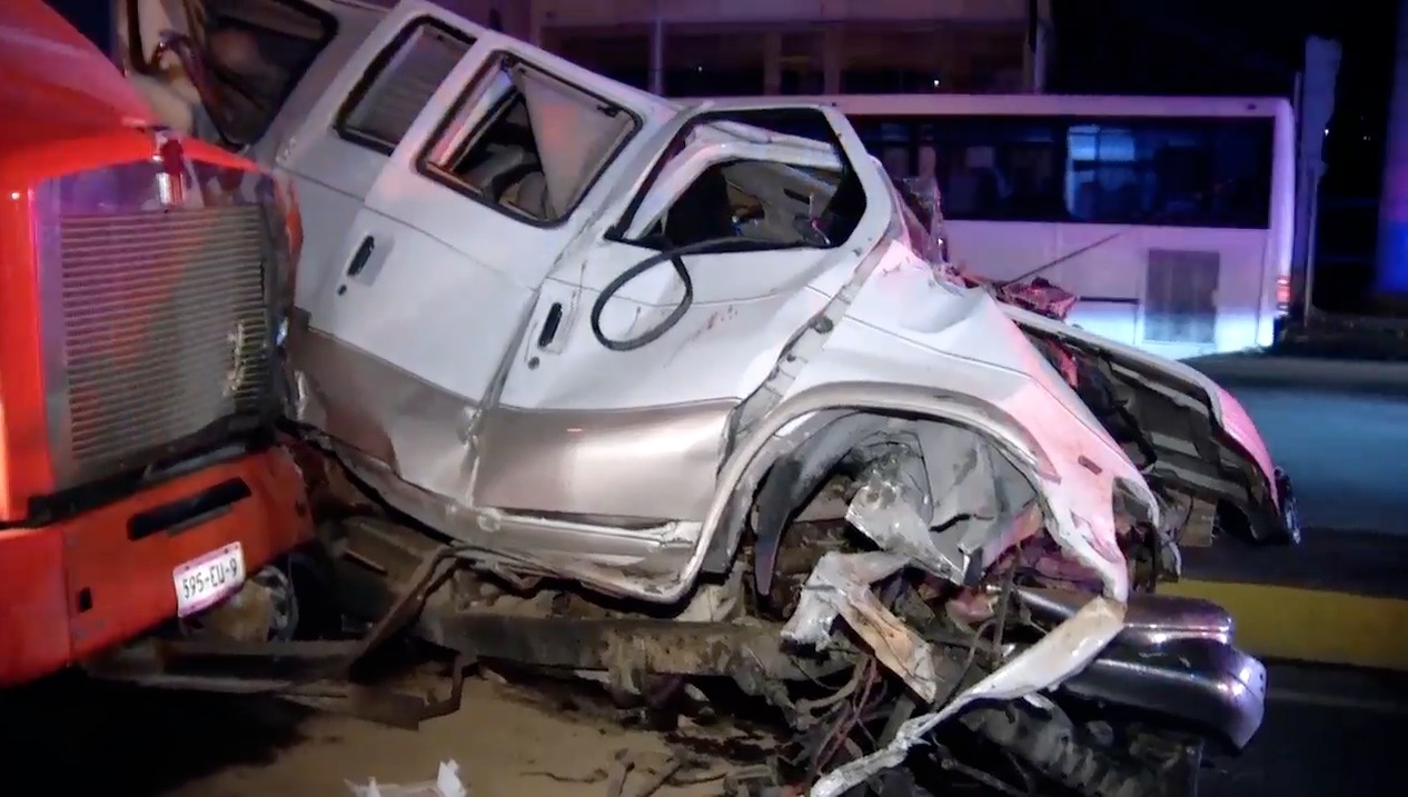 Una camioneta Van quedó destrozada tras ser impactada y arrastrada varios metros por un tráiler de doble remolque en la colonia Condesa al sur de la ciudad, resultando dos personas heridas