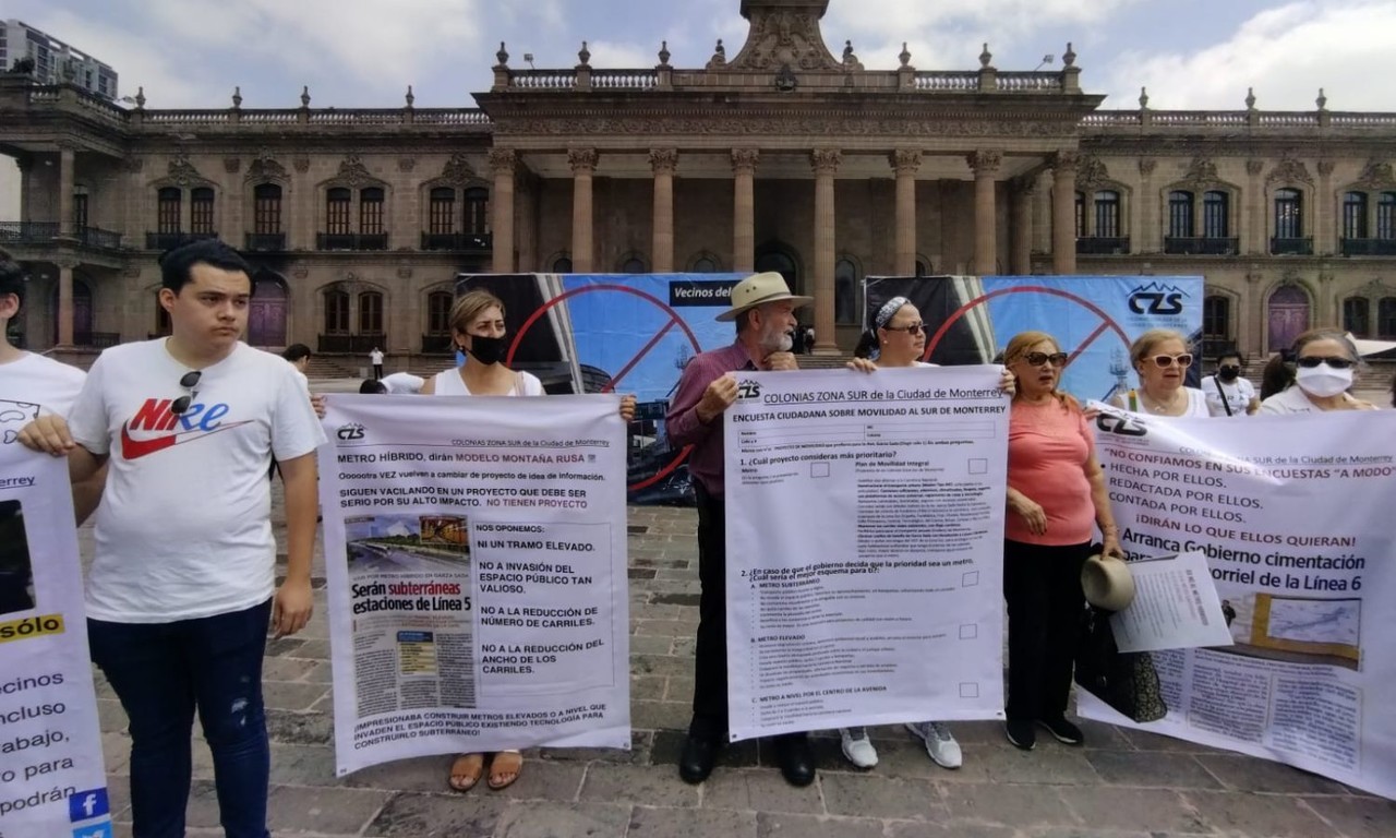 Al inconformarse contra el modelo híbrido que se contempla para la Línea 5 del Metro, habitantes del sur de Monterrey alistan amparos contra la obra.Durante una protesta en la Explanada de los Héroes, los colonos explicaron que a inicios de año tramitaron el recurso legal, sin embargo, no fue efectivo debido a que no existía todavía un proyecto.“El amparo es nuestra esperanza, hasta ahorita es nuestra esperanza porque el Gobierno no escucha y porque se está imponiendo.“Tenemos un amparo, pero durante todo este tiempo le decían a la jueza que no hay metro, no hay proyecto; gracias a que en marzo dijeron que la obra es de utilidad pública ahora están obligados a contestar”, compartió Lourdes Garza, de la colonia Contry. Fueron aproximadamente 20 vecinos quienes, con pancartas y consignas, se mostraron contra el próximo arranque de la construcción programado para junio.Este jueves El Horizonte adelantó que para la Línea 5 se contempla un modelo híbrido, con la mayoría de las estaciones subterráneas y con los trenes circulando al nivel de la avenida Eugenio Garza Sada.Y aunque el secretario de Movilidad, Hernán Villarreal, aseguró que se consultó a los vecinos sobre el proyecto, éstos aseguran que no hubo oportunidad de participar y que levantarán su propia encuesta.“Empezamos hace cuatro días, se realiza en todas las colonias del sur, ya estuvimos este fin de semana, somos 37 colonias.“Hemos hecho 513 encuestas; el 97.4% quiere un metro subterráneo, cada encuesta tiene nombre, domicilio, INE y colonia”, dijo Garza.A la protesta acudió además la diputada Federal del PRI, Karina Barrón, quien aseguró que durante los reuniones entre el Gobierno y los vecinos únicamente se mostró una foto del proyecto, si más detalles.