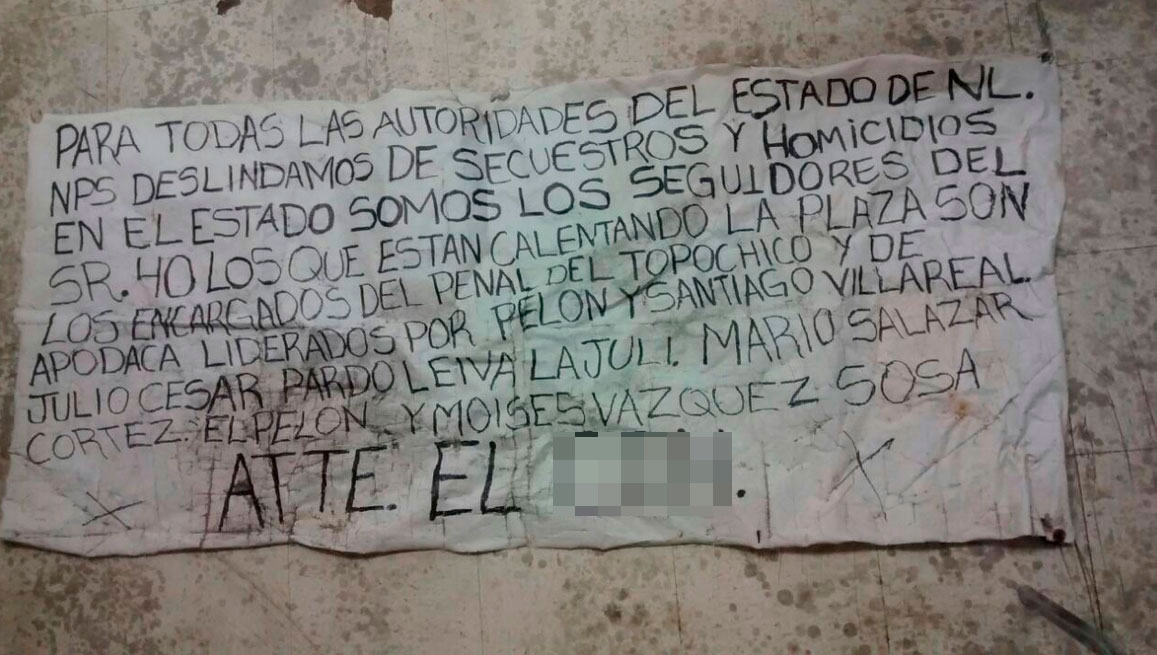 “Para todas las autoridades del estado Nuevo León nos deslindamos de secuestros y homicidios en el estado, somos seguidores del Sr. 40. Los que están calentando la plaza son los encargados del penal del Topo Chico y Apodaca, liderados por ‘El Pelón’ y Santiago Villarreal, Julio Cesar Pardo Leiva ‘La July’, Mario Salazar Cortez ‘El Pelón’ y Moisés Vázquez Soza ‘La Molleja’. Atte: El CDN”, indican ambas mantas.