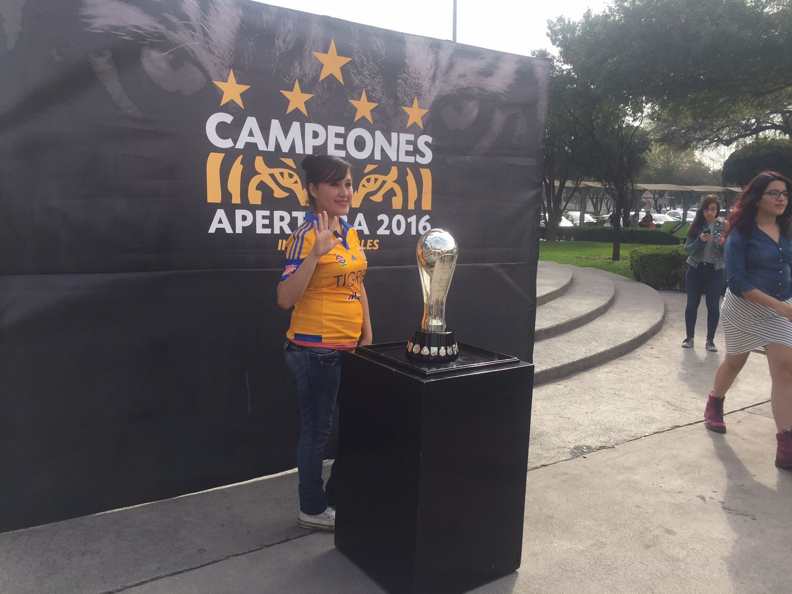 El trofeo fue instalado en la Explanada de la Rectoría, justo al pie de la Flama de la Verdad, donde alumnos aficionados al equipo de fútbol Tigres hicieron fila para la fotografía.