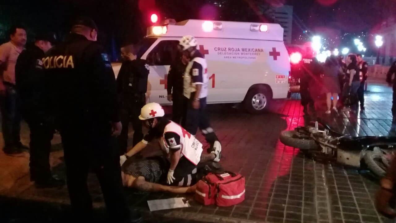Dos tripulantes de una motocicleta quedaron lesionados tras impactar la unidad contra una patrulla de la Policía Regia, en el primer cuadro de Monterrey