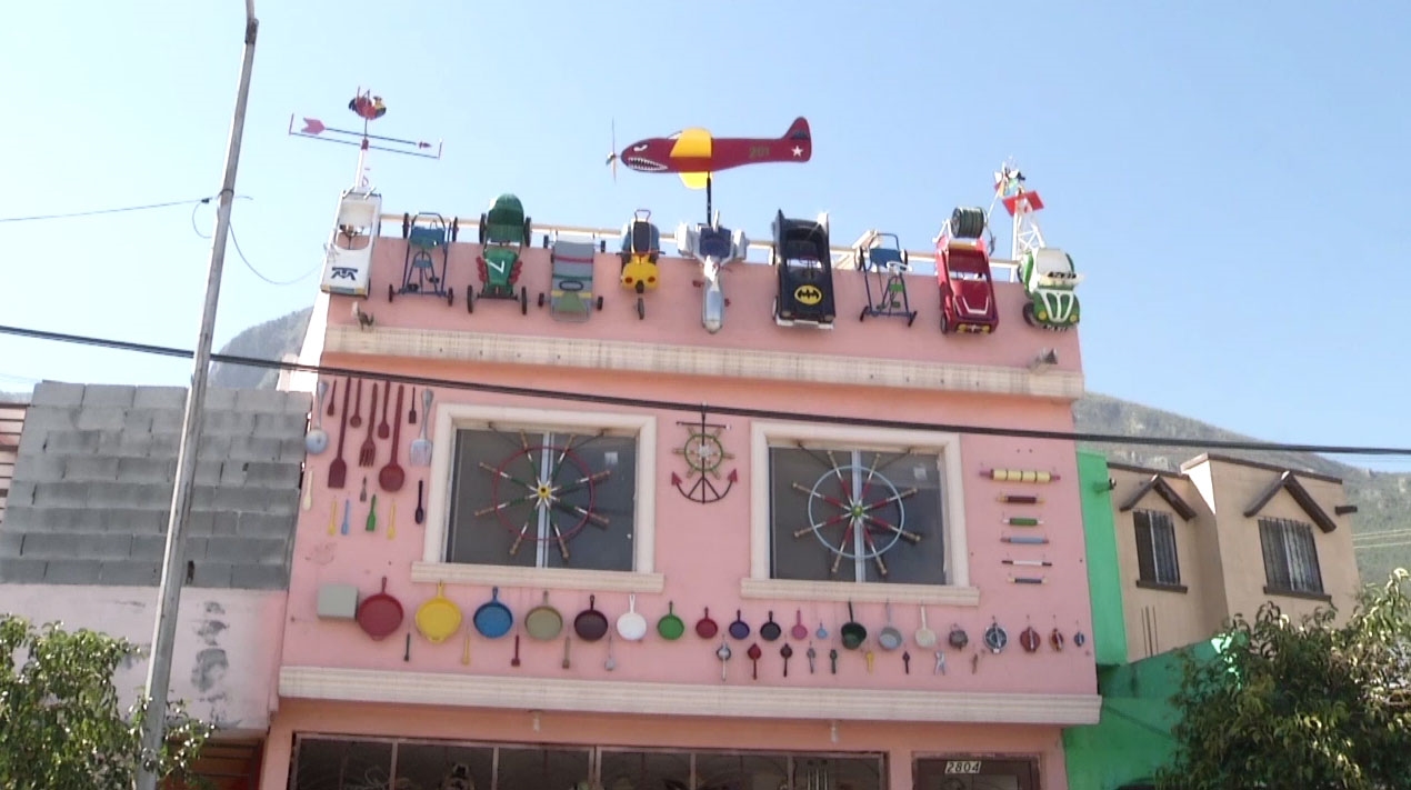 En la parte alta de la casa, ubicada en la colonia El Peñón, tiene 10 carros antiguos para niños pintados, los cuales los vigila un avión tipo kamikaze