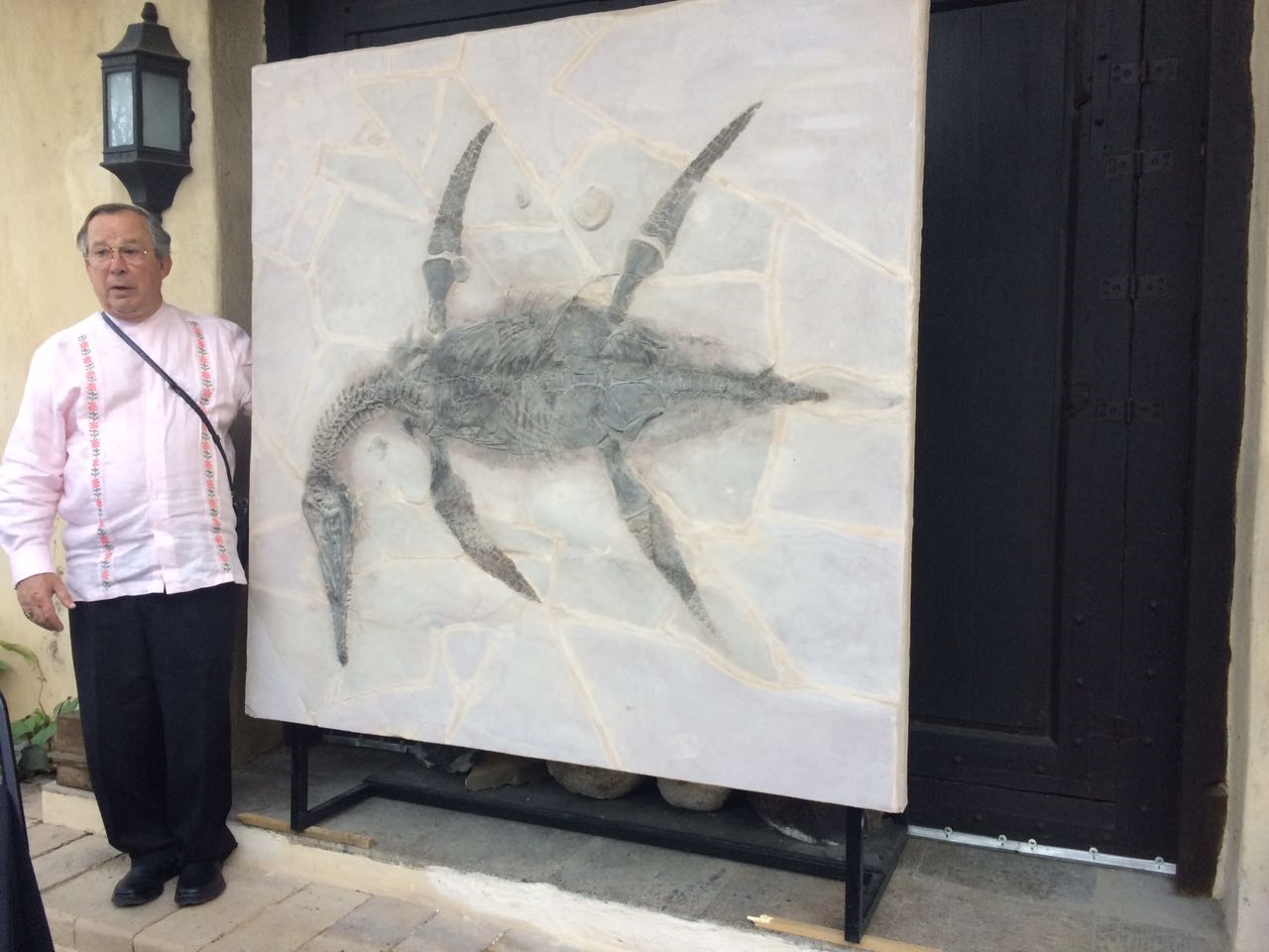 Tras seis años de estudio, este lunes el presidente municipal, que es coleccionista de fósiles y de arte, y los expertos mostraron este plesiosaurio, un reptil marino hasta ahora único en su género y único en su especie.