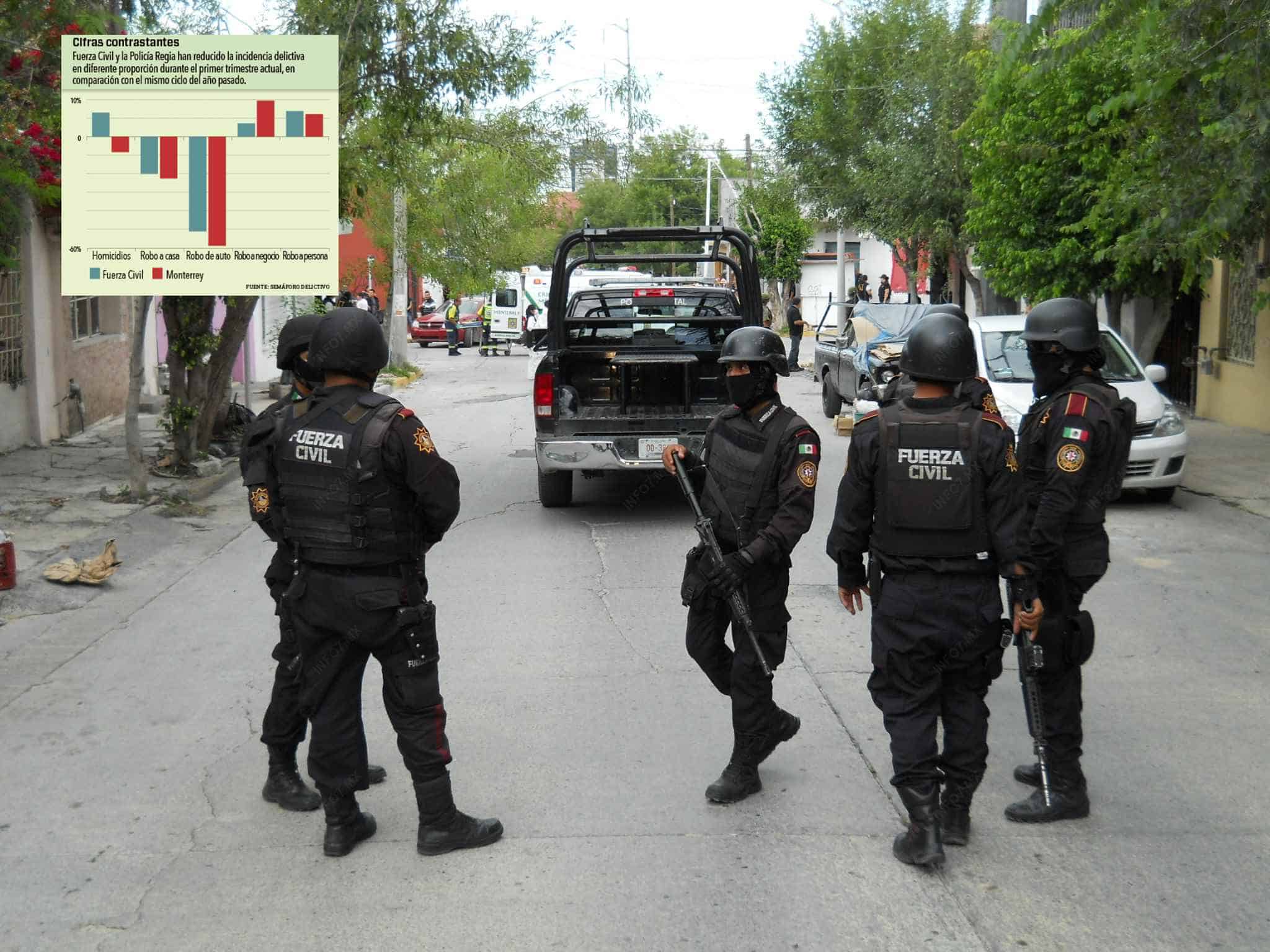 Pese a ser una corporación de élite, el desempeño de Fuerza Civil ha sido inferior frente al de la Policía Regia, pues según cifras oficiales los homicidios crecieron 13% respecto al primer trimestre del año pasado en el territorio que cuida la corporación estatal.