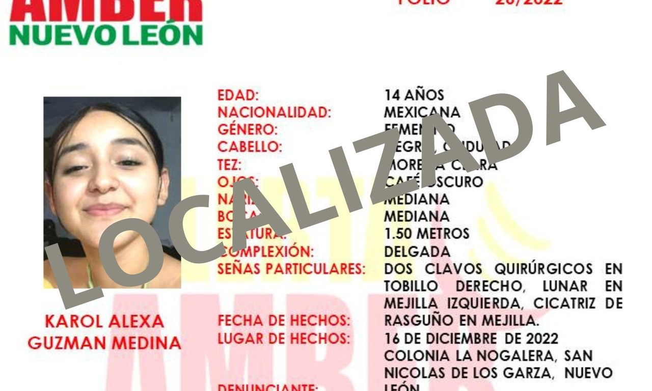 La adolescente Karol Alexa Guzmán Medina, de 14 años, había desaparecido en el estacionamiento de su secundaria en la colonia Nogalera, San Nicolas de los Garza.Familiares de Karol Alexa Guzmán Medina, quien se encontraba desaparecida desde el pasado 16 de diciembre, informaron que la adolescente de 14 años fue localizada.'Baje hasta el último escalón... Pero la encontramos... Gracias', reportó su Esthela Mediana este lunes 19 de diciembre.También señalaron que la joven había aparecido sana y salva, y que ya estaba con su mamá y familiares.El reporte de búsqueda indicaba que la joven, de cabello negro ondulado y de tez morena clara, el día de su desaparición vestía una blusa color negro, pantalón de mezclilla color negro y tenis color blanco, lleva una maleta camuflajeada color verde militar.Asimismo, que el paradero de la menor era desconocido luego de que se le viera salir de la secundaria N° 30 Rogelio de León, en San Nicolás.Por las condiciones de la desaparición, edad y tiempo transcurrido, se consideraba que la menor pudiera estar en peligro inminente.Aunque los familiares confirmaron que Karol Alexa ya se encontraba con ellos, no brindaron más detalles del hallazgo.