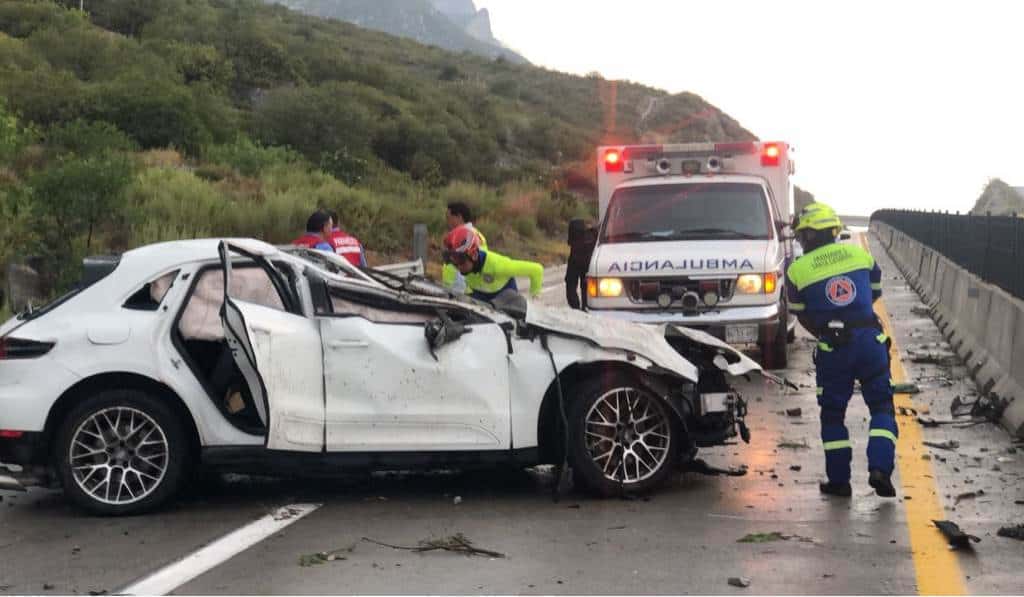 El automóvil, de la marca Porche, con placas del estado de Morelos, quedó destrozado. Al lugar del accidente llegaron elementos de Protección Civil de Santa Catarina y de la Policía Federal.