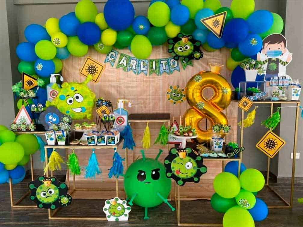 Globos de colores, figuras del virus, dulces con la imagen del coronavirus y sin faltar pequeños geles antibacteriales adornan esta creativa mesa de ambientación.