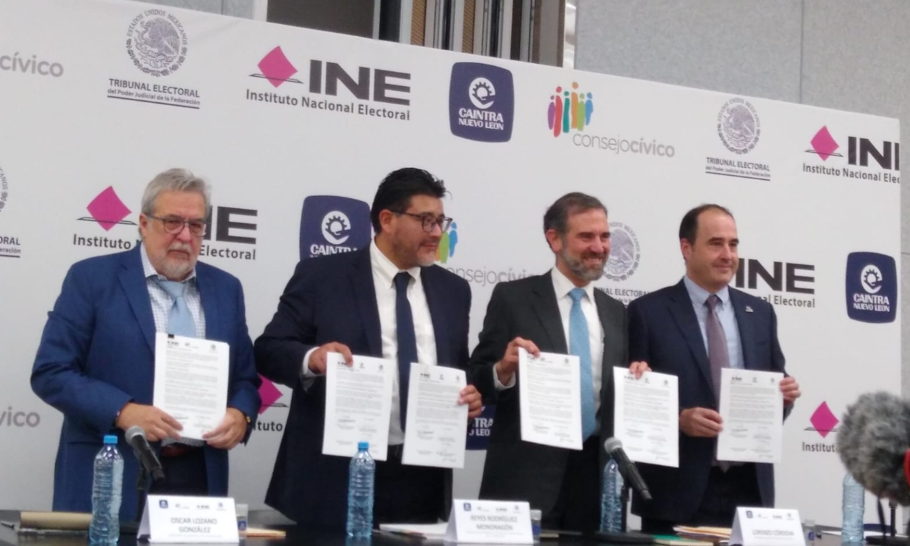 En Nuevo León, el presidente del INE, Lorenzo Córdova, y el presidente del Tribunal Electoral del Poder Judicial de la Federación, Reyes Rodríguez, firmaron con el presidente de la Cámara de la Industria de la Transformación (Caintra) Rodrigo Fernández, y el presidente del Consejo Cívico de Nuevo León, Óscar Lozano, un convenio para promover el voto y elevar la participación ciudadana en las urnas. En el lanzamiento del acuerdo, celebrado en la UDEM, Córdova aclaró que este convenio busca cerrarle la puerta a retrocesos democráticos."Todos estos problemas sólo se podrán resolver en el marco de la propia democracia y con más democracia, es decir, bajo las condiciones y principios del mismo arreglo democrático, sin atajos antidemocráticos que pretenden una mayor eficacia y repudiando las falsas salidas que suspenden derechos y el orden constitucional, estoy seguro que la firma de este convenio nos coloca por esa ruta, lo que debe ser motivo de entusiasmo y confianza ante los tiempos por venir", expresó el titular del INE.El presidente de Caintra detalló los alcances. "Nuestro propósito central es elevar el involucramiento de los ciudadanos en las decisiones de política, así es como desde la trinchera empresarial en los micro, pequeños, medianos y grandes empresarios y los más de 600 mil trabajadores del sector industrial y sus familias, impulsaremos que todo ciudadano ejerza su derecho al voto y podamos consolidar la democracia que queremos", explicó Fernández Martínez.A su vez, el presidente del Tribunal Electoral a nivel nacional definió el reto."Desde el Tribunal Electoral, la contribución es garantizar y proteger el ejercicio de los derechos políticos, los derechos electorales de las y los mexicanos y hacer del Estado de Derecho la vía para la convivencia social", sostuvo Rodríguez.
