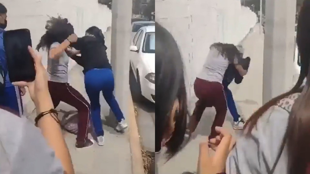 A través de redes sociales se captó el momento en que dos estudiantes de una secundaria en el municipio de San Pedro Garza García se pelearon.En esta ocasión fueron dos jovencitas de la secundaria técnica No. 4 Manuel González Rangel ubicada en el mencionado municipio.De acuerdo con un video que circula en redes sociales, varios adolescentes, en su mayoría mujeres, caminan por fuera de la escuela.Las mujeres que van a pelear van al frente, mientras atrás va el resto grabando con sus celulares.La adolescente con el pantalón en color guindo y blusa gris es la que agrede primero al empujar a la menor de pantalón azul rey y sudadera negra, quien después se defiende y comienza una pelea a golpes y jalones de cabello.Por su parte, el resto de las adolescentes no hacen nada por detener la pelea, incluso una menor sin dejar de grabar, suelta varios golpes a la adolescente de pantalón azul rey.Finalmente las dos mujeres se separaron y un menor (que acompañaba a la estudiante de pantalón azul) se interpuso entre las dos para evitar que se volvieran a pelearEn el video se alcanza a escuchar qué una de las menores grita 'hay viene la Policía'.Aunque la denuncia en redes sociales reclama la actuación de las autoridades escolares, los usuarios señalaron la educación qué reciben actualmente los menores de edad, así como algunos también responsabilizaron a los padres de familia.Con información de Info7.mx.