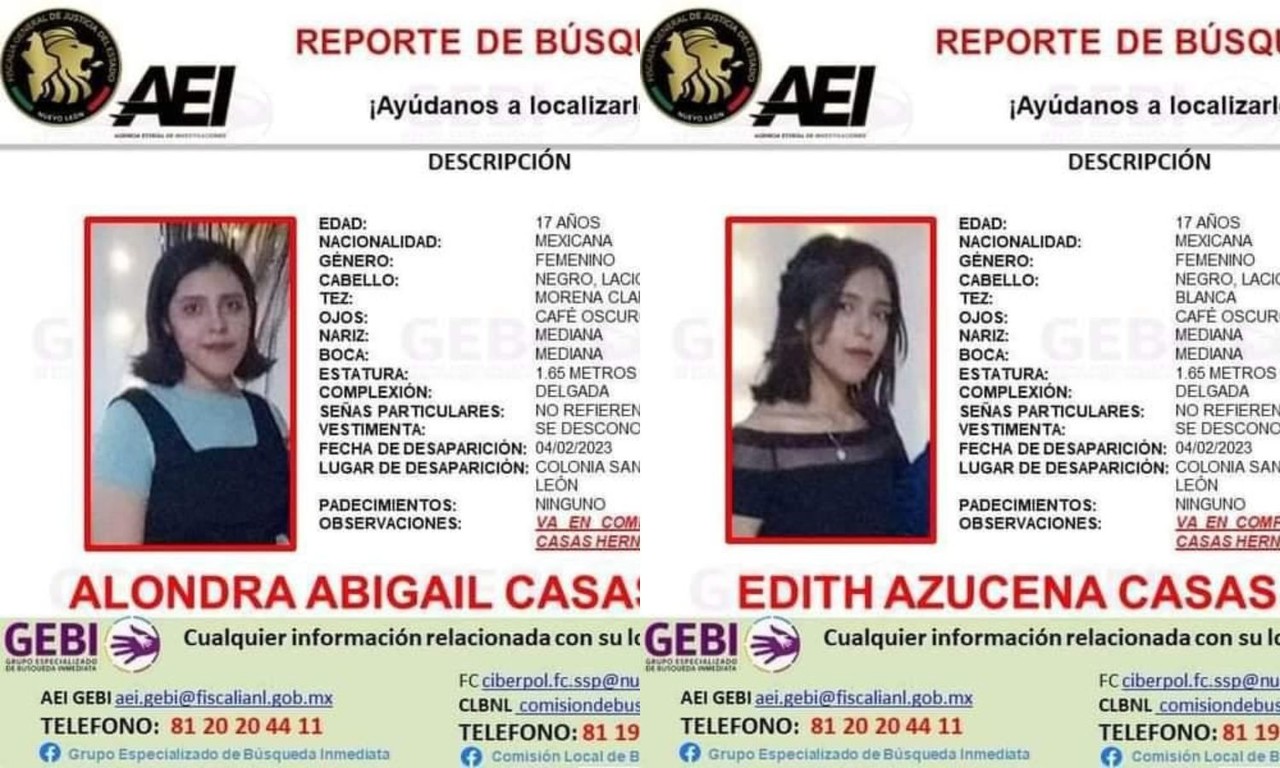 Edith Azuecena y Alondra Abigail Casas Hernández fueron vistas por última vez el pasado 4 de febrero en la colonia San Juan de Guadalupe, en Monterrey.