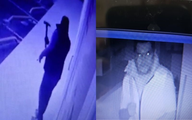 En el video captado por las cámaras de seguridad se observa primero que el hombre golpea en varias ocasiones hasta que logra romper la puerta, después se aleja para revisar que no pase nadie por el lugar.