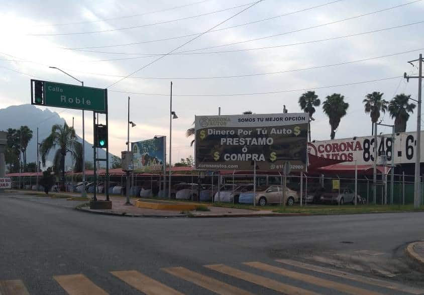 El negocio dedicado a la compra venta de automóviles está situado en el cruce de las calles Cristobal Colón y Roble, en el centro de Monterrey.