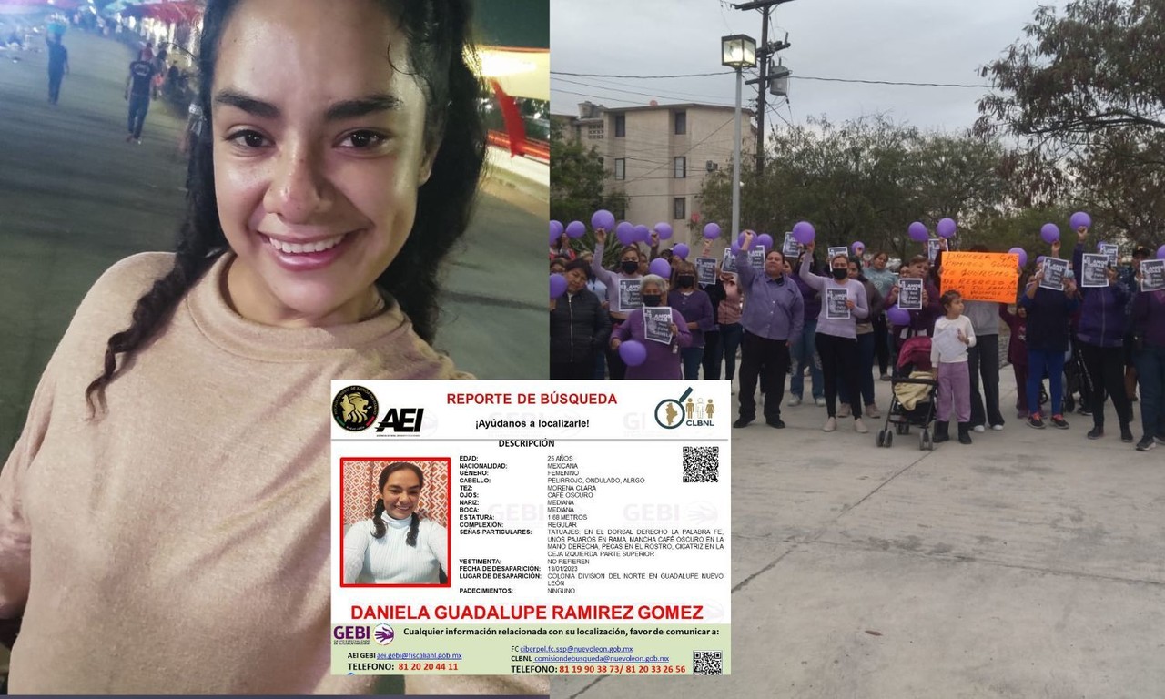 La desaparición de una mujer mantiene en una angustia absoluta a su familia, amigos y vecinos en la colonia Arboledas del Oriente, en el municipio de Guadalupe.El pasado 13 de enero Daniela Guadalupe Ramirez Gómez, de 27 años, casada y con una hija de cuatro años, salió de su casa en el municipio de Guadalupe, para ir a su trabajo, al parecer un domicilio donde realiza actividades de limpieza, pero ya no regreso a su casa.Sus familiares pusieron la denuncia en la Fiscalía General de Justicia de Nuevo León y se publicó un reporte de búsqueda donde se pide la colaboración de la ciudadanía para localizar a Daniela, pues ya tiene seis días de haber desaparecido.En la ficha de búsqueda, las autoridades informan la descripción de Daniela, y el lugar en el que desapareció fue en la colonia División del Norte, en Guadalupe.La tarde de este jueves vecinos y familiares de la joven desaparecida realizaron una protesta pacífica en una plaza de la colonia Arboledas del Oriente, lugar donde Daniela creció de niña con su mamá.Ahí las mujeres clamaron justicia, ya que aseguran el proceso de búsqueda ha sido lento por parte de autoridades de la Fiscalía de Justicia.Las feministas lanzaron consignas, mientras vestían de color morado y sostenía globos del mismo color, en señal de apoyo.'No estamos todas, nos falta Daniela ...', se leía en algunas pancartas. Es uno de los mensajes que están impresos con su fotografía en hojas que son colocadas en puntos de búsqueda.