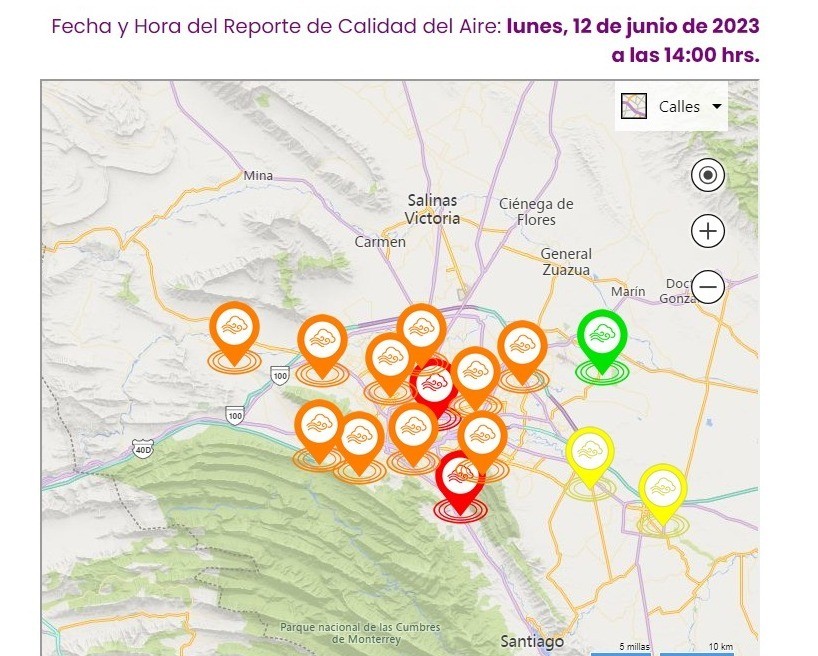 Doce de las quince estaciones de monitoreo ambiental reportan condiciones de malas a muy malas en la calidad del aire de la metrópoli. Contrario a lo que comúnmente se registra, en esta ocasión el ozono es el contaminante que predomina en la ciudad en al menos nueve zonas. El índice más alto se observa en Universidad donde se concentran 143 partes por billón (ppb), por lo que se marca en rojo con muy mala calidad del aire. También la estación de Pueblo Serena se ubica en ese mismo color, con 136 ppb en dicho contaminante. Además de éstas, Santa Catarina, San Bernabé, Misión San Juan (García 2), Escobedo, Obispado y San Nicolás muestran concentraciones de Ozono, con valores que van de los 117 a los 127 ppb, colocándolas en malas condiciones, por lo que aparecen en naranja. En ese mismo color, están García, La Pastora y Apodaca; sin embargo, en las dos primeras estaciones predominan las partículas PM10 con valores de 133 y 87 microgramos por metro cúbico (µgr/m3); y en la tercera, las partículas finas ó PM2.5 en donde se alcanzó los 50 µgr/m3. Por otro lado, Cadereyta registra 65 (µgr/m3) en PM10; y Juárez 44 µgr/m3 en PM2.5, que las conserva en una calidad del aire regular, observándose en amarillo. La única estación en la que hay buenas condiciones es Pesquería, que reporta 43 µgr/m3 en PM10. Por ello, se exhorta a la población en general a no realizar actividades físicas moderadas y vigorosas al aire libre, así como atenderse en caso de presentar síntomas respiratorios o cardíacos.